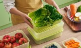 Ovoce, zelenina a saláty – mikroventilační zóny víka regulují proudění vzduchu, takže se v dóze netvoří nadměrná vlhkost. Jahody zůstanou svěží, listové saláty neuvadnou a nakrájené ovoce si déle udrží šťavnatost.