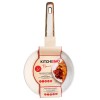 Pánev Kitchisimo Bianco je dokonalou kombinací stylu a funkčnosti. Menší pánev o průměru 20 cm je ideální pro přípravu snídaní, omelet, sázených vajec nebo menších porcí – rychle se zahřívá a skvěle padne do ruky. Na první pohled zaujme svým světle krémovým odstínem s jemným vroubkováním po obvodu, který působí elegantně a přitom moderně. Uvnitř najdete vysoce odolný keramický povrch v béžové barvě s kameninovým vzhledem, kde drobné černé tečky připomínají strukturu žuly – nejen estetický detail, ale i důkaz precizního zpracování. Tělo pánve je vyrobeno z pevného silnostěnného hliníku, který se při vysokých teplotách nekroutí a perfektně rozvádí teplo po celé ploše, takže jídlo se propeče rovnoměrně a bez připálení. Ergonomická rukojeť z odolného plastu s povrchem imitujícím dřevo je příjemná na dotek a díky sametovému povrchu Soft Touch nabízí jistý úchop i při vyšší teplotě. Pánev je ideální pro každodenní vaření, smažení i restování, a díky svému designu krásně ladí s moderními i přírodními kuchyněmi.