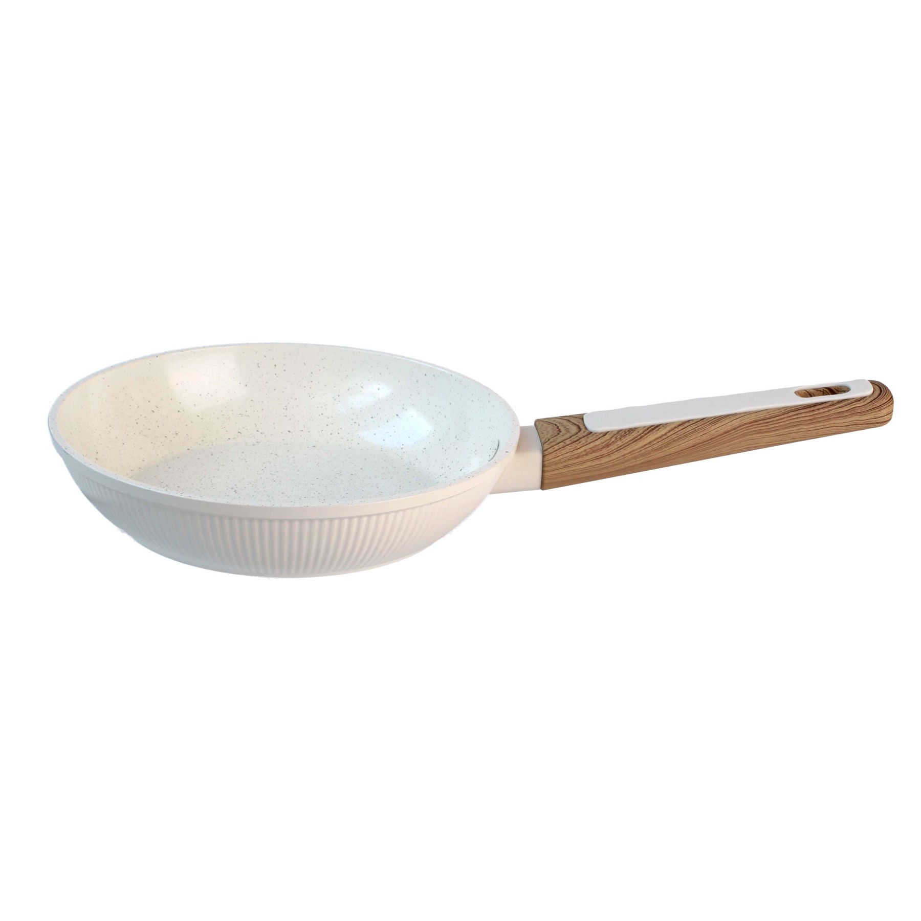 Pánev Kitchisimo Bianco je dokonalou kombinací stylu a funkčnosti. Univerzální pánev o průměru 24 cm patří k nejoblíbenějším velikostem – zvládne přípravu masa, zeleniny i omáček a díky optimální hloubce se hodí pro každodenní vaření. Na první pohled zaujme svým světle krémovým odstínem s jemným vroubkováním po obvodu, který působí elegantně a přitom moderně. Uvnitř najdete vysoce odolný keramický povrch v béžové barvě s kameninovým vzhledem, kde drobné černé tečky připomínají strukturu žuly – nejen estetický detail, ale i důkaz precizního zpracování. Tělo pánve je vyrobeno z pevného silnostěnného hliníku, který se při vysokých teplotách nekroutí a perfektně rozvádí teplo po celé ploše, takže jídlo se propeče rovnoměrně a bez připálení. Ergonomická rukojeť z odolného plastu s povrchem imitujícím dřevo je příjemná na dotek a díky sametovému povrchu Soft Touch nabízí jistý úchop i při vyšší teplotě. Pánev je ideální pro každodenní vaření, smažení i restování, a díky svému designu krásně ladí s moderními i přírodními kuchyněmi.