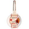 Pánev Kitchisimo Bianco je dokonalou kombinací stylu a funkčnosti. Velká pánev o průměru 28 cm nabízí dostatek prostoru pro rodinné vaření – ideální na restování, větší porce masa, zeleninové směsi nebo přípravu pokrmů pro více osob. Na první pohled zaujme svým světle krémovým odstínem s jemným vroubkováním po obvodu, který působí elegantně a přitom moderně. Uvnitř najdete vysoce odolný keramický povrch v béžové barvě s kameninovým vzhledem, kde drobné černé tečky připomínají strukturu žuly – nejen estetický detail, ale i důkaz precizního zpracování. Tělo pánve je vyrobeno z pevného silnostěnného hliníku, který se při vysokých teplotách nekroutí a perfektně rozvádí teplo po celé ploše, takže jídlo se propeče rovnoměrně a bez připálení. Ergonomická rukojeť z odolného plastu s povrchem imitujícím dřevo je příjemná na dotek a díky sametovému povrchu Soft Touch nabízí jistý úchop i při vyšší teplotě. Pánev je ideální pro každodenní vaření, smažení i restování, a díky svému designu krásně ladí s moderními i přírodními kuchyněmi.