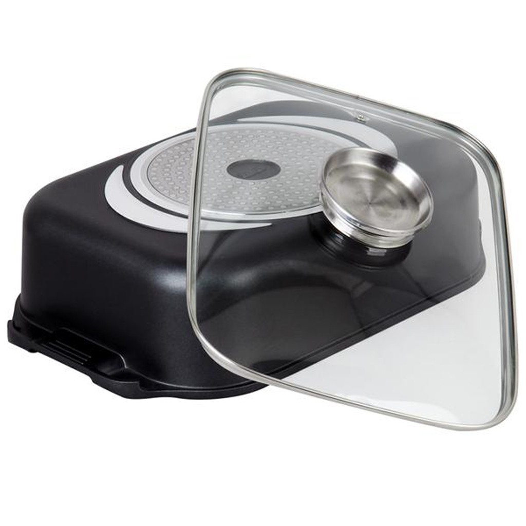 Hliníkový pekáč s nepřilnavým povrchem je nezbytným nádobím na přípravu masa, zeleniny, sladkostí i dalších pokrmů. Skleněné poklice má masivní nerezové úchyty a otvor na únik přebytečné páry. Pekáč lze používat na indukční varné desce i v troubě (do 240 °C).
