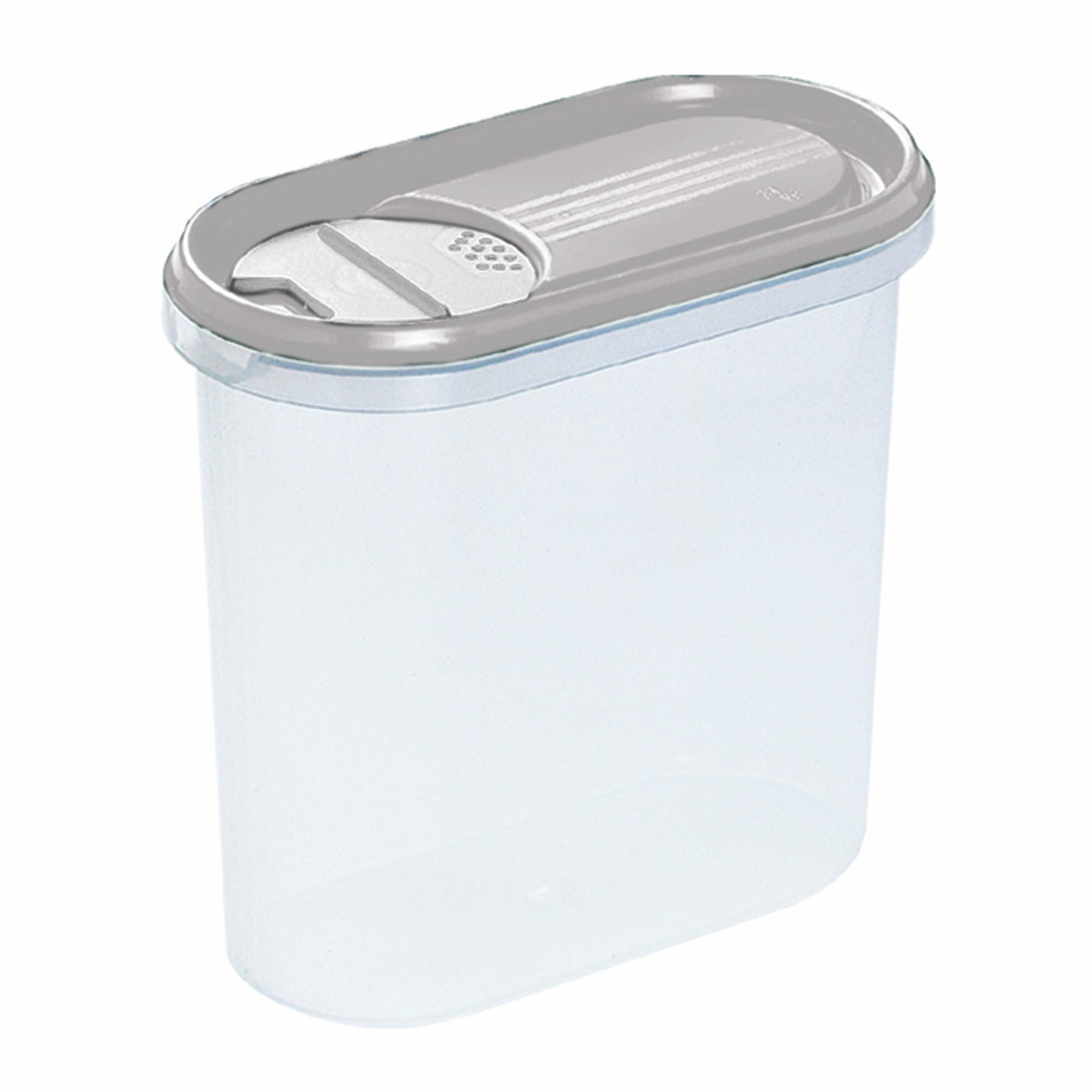 Plastová dóza na suché potraviny o objemu 2 litry je ideálním řešením pro každodenní skladování v kuchyni. Skvěle se hodí na mouku, cukr, rýži, těstoviny, luštěniny nebo kávu – zkrátka vše, co potřebujete mít přehledně uložené a vždy po ruce. Hlavní předností je praktické víčko s otočným regulátorem, které umožňuje snadno zvolit způsob sypání. Jednoduchým pootočením si nastavíte jemné dávkování přes malé otvory, rychlejší sypání větším otvorem nebo dózu úplně uzavřete. Práce v kuchyni je tak pohodlná, přesná a bez zbytečného nepořádku.