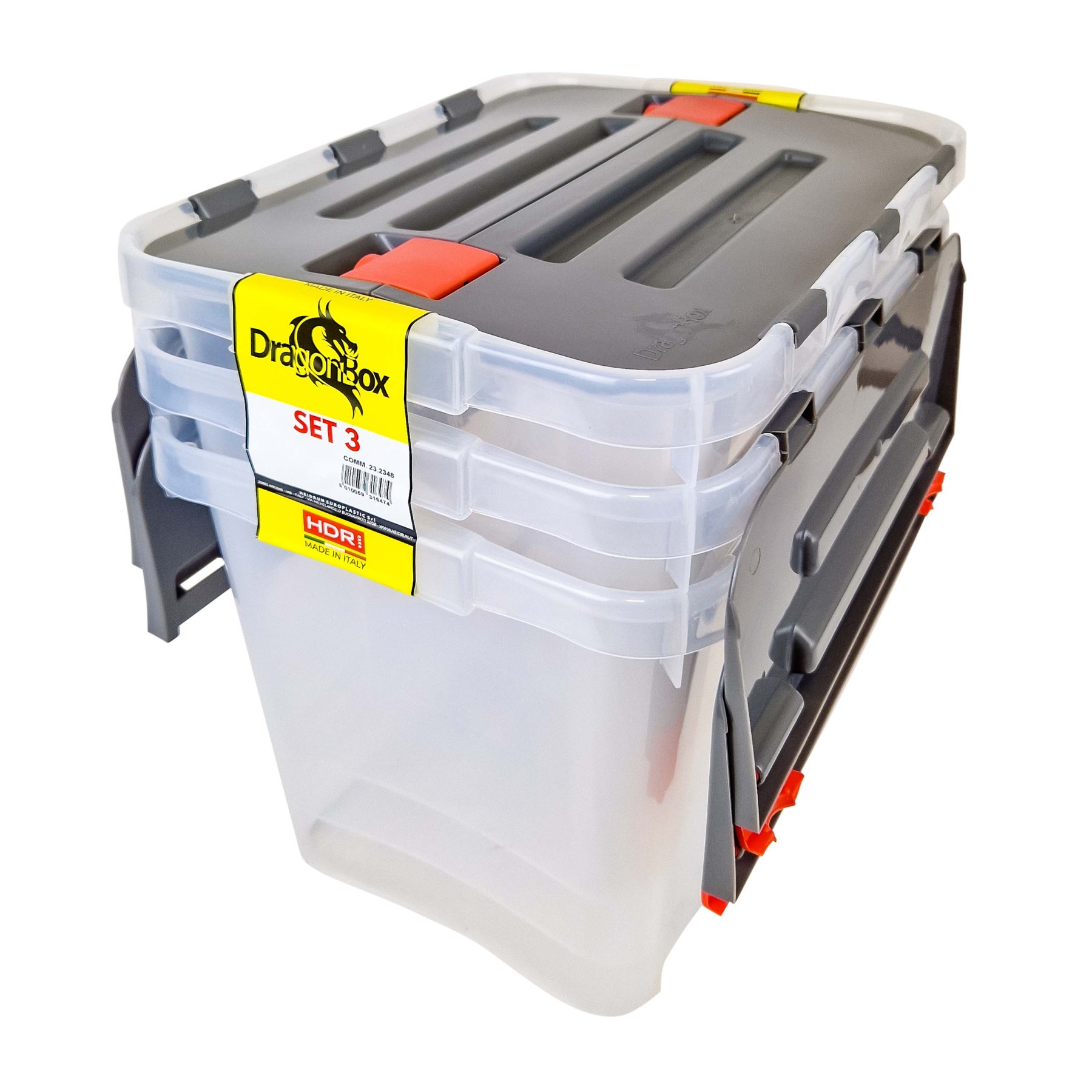 Sada plastových úložných boxů HEIDRUN 24 litrů s praktickým víkem. Kvalitní plastový box je skvělý pomocník na uchování, skladování a ochranu velkých věcí i drobností, oblečení, hraček i peřin. Úložná krabice ochrání vše před nečistotami, prachem, vlhkem a poškozením. Díky transparentnímu materiálu máte vše přehledně a bezpečně uloženo na policích, ve skříni nebo pod postelí. Své velké uplatnění najdou úložné boxy i v garáži nebo dílně. Jednoduché ovládání dvoudílného odklápěcího víka. Sada obsahuje 3 úložné boxy s víkem.