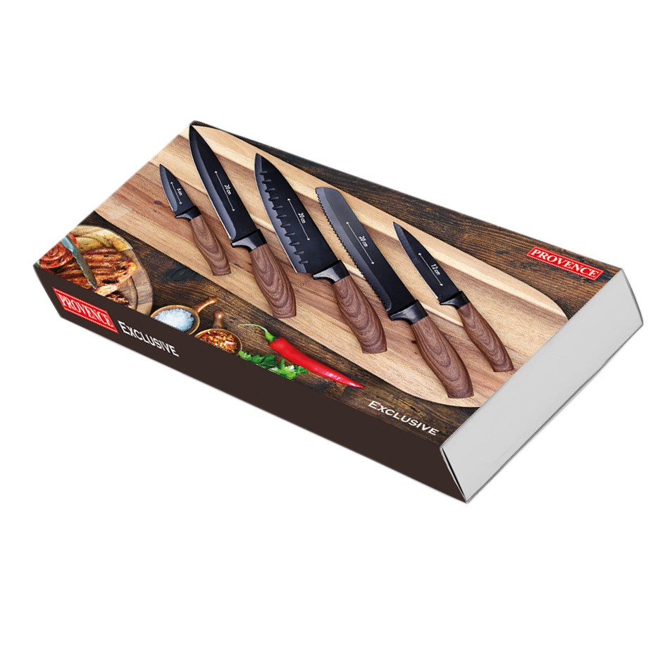 Sada nožů PROVENCE EXCLUSIVE obsahuje 5 ks nejpoužívanějších nožů. Nože mají ergonomickou rukojeť s imitací dřeva, ostrou čepel s nepřilnavým povrchem. Jsou vysoce odolné a snadno se čistí.