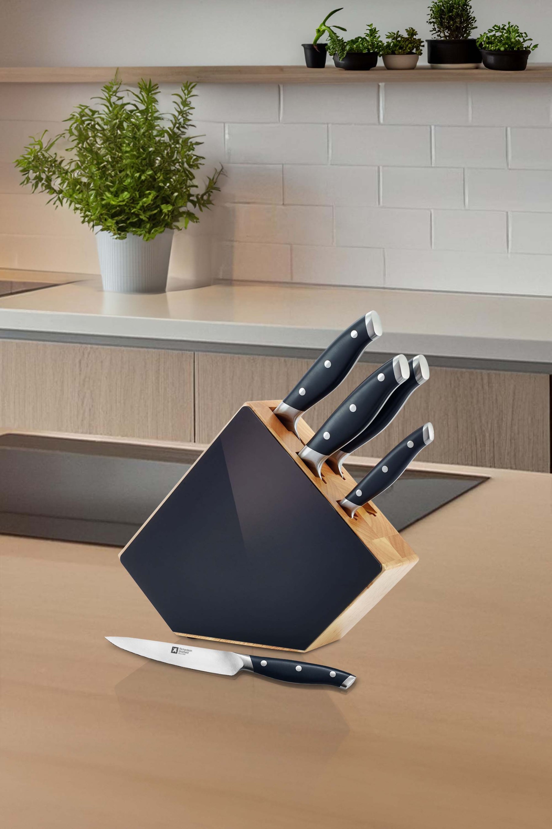 Ergonomická full tang rukojeť s trojitými nýtky přináší maximální kontrolu, jistý úchop a elegantní vzhled inspirovaný profesionálními kuchyňskými noži. Každý detail – od vyvážené hmotnosti po luxusní povrchovou úpravu – odráží dlouholetou tradici značky Richardson Sheffield, která pod značku Amefa spadá a patří mezi světovou špičku v oboru kuchyňských nožů. Elegantní dřevěný blok působí jako designový prvek kuchyňské linky — nože v něm mají své místo, jsou bezpečně uloženy, připraveny k použití a zároveň vizuálně přitažlivé.