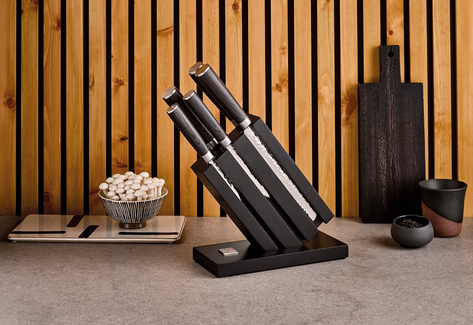 Černý blok v elegantním matu nejen bezpečně chrání nože, ale zároveň podtrhuje jejich moderní siluetu – vytváří kontrast mezi lesklým ostřím a tmavým povrchem, který působí luxusně a čistě. Nože jsou dokonale vyvážené, padnou do ruky a při práci poskytují jistotu i pohodlí. Taper-broušené čepele zajišťují precizní kontrolu nad každým pohybem, ať už krájíte maso, zeleninu nebo pečivo.