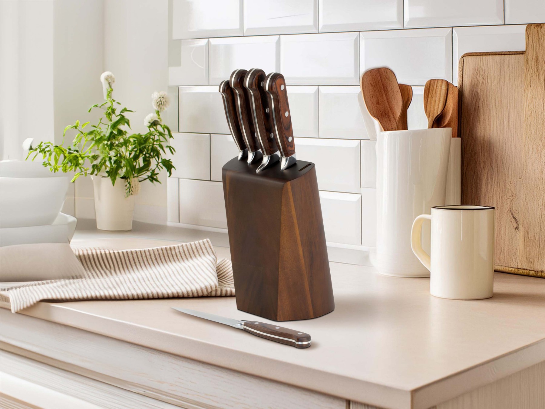 Sada RICHARDSON SHEFFIELD Virtuose je ukázkou toho, jak lze spojit profesionální výkon s přirozenou krásou materiálu. Elegantní blok z akáciového dřeva se stává dominantou kuchyňské linky – nejenže chrání čepele a udržuje nože přehledně po ruce, ale zároveň působí jako stylový doplněk s přírodním charakterem. V kombinaci s lesklými čepeli z martenzitické nerezové oceli vytváří harmonii tepla a kovového lesku, která z každé kuchyně udělá místo, kde se vaření stává radostí.