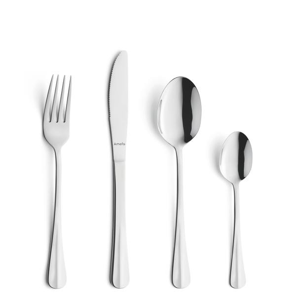 Sada příborů AMEFA Napoli představuje precizní spojení minimalistického designu a funkčního provedení. Vyrobena z nerezové oceli 18/0 s vysoce lesklou „mirror“ povrchovou úpravou, dodává každému dekoračnímu stylu sofistikovaný nádech. Střed rukojeti je decentně zvýšený, což přidává vizuální výraz i lepší pocit při držení. Díky kompletnímu vybavení pro 6 osob (6 nožů, 6 vidliček, 6 lžic, 6 kávových lžiček) máte vše potřebné pro běžné stolování i slavnostní příležitosti — kvalitní materiál, elegantní tvar a nadčasový vzhled zaručují, že sada Napoli obstojí i při náročnějším servírování.