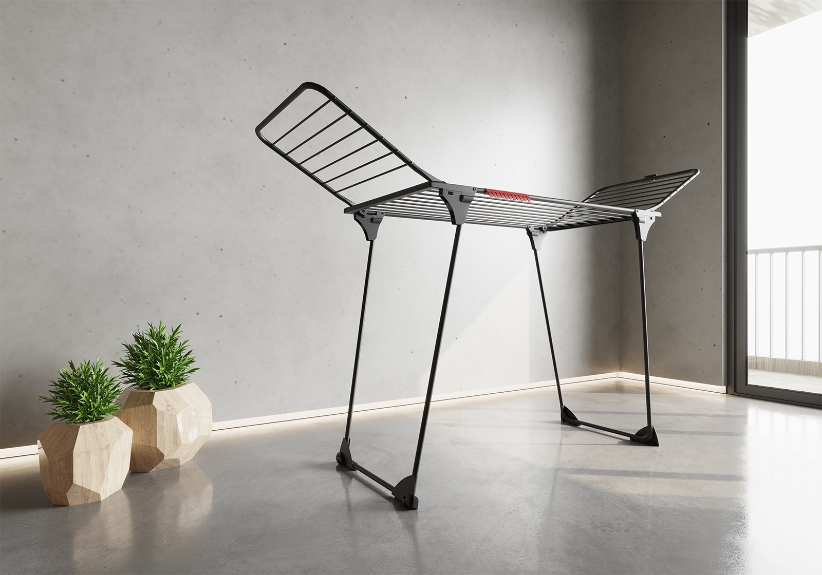 Vileda King je vysoce stabilní a praktický sušák na prádlo, který kombinuje moderní design s funkčními prvky, aby bylo sušení prádla co nejefektivnější. Jeho elegantní matně černé provedení s červenými a antracitovými detaily dodává domácnosti moderní vzhled.