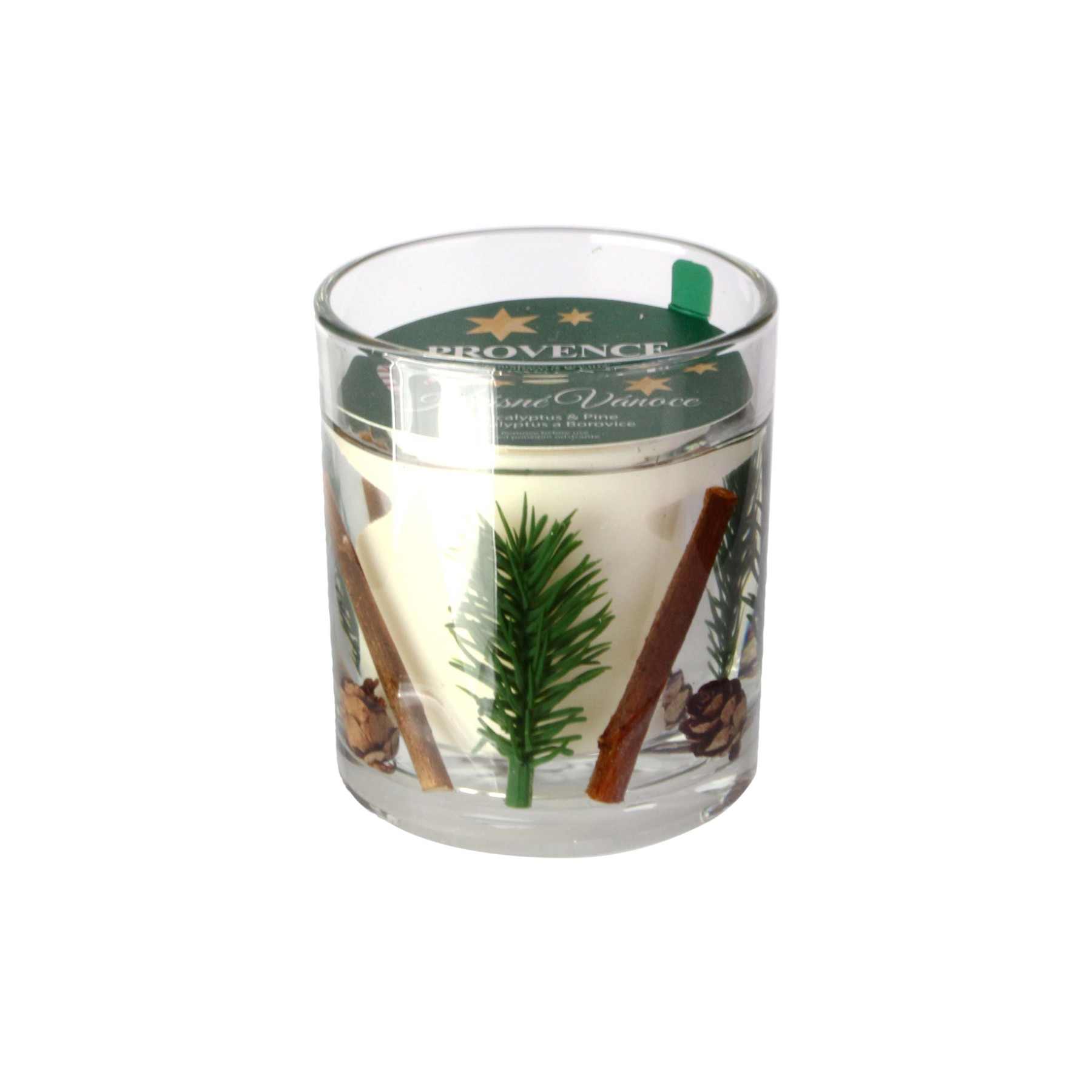 Vonná svíčka Provence – eukalyptus & Borovice (18 hodin) je skutečným klenotem mezi vánočními dekoracemi. Unikátní dvojité sklo ukrývá mezi stěnami speciální gel s dekorativní výplní – kousky jehličí, celou skořici a malé šišky, které společně vytvářejí úžasný zimní efekt. Po zapálení svíčky se světlo krásně odráží mezi vrstvami skla a gelu, čímž vzniká hřejivá atmosféra připomínající lesní klid. Vůně eukalyptu a borovice dodává svěžest, čistotu a přirozenou energii, která nádherně doplní zimní období i sváteční chvíle s rodinou.