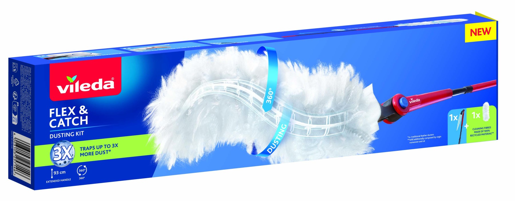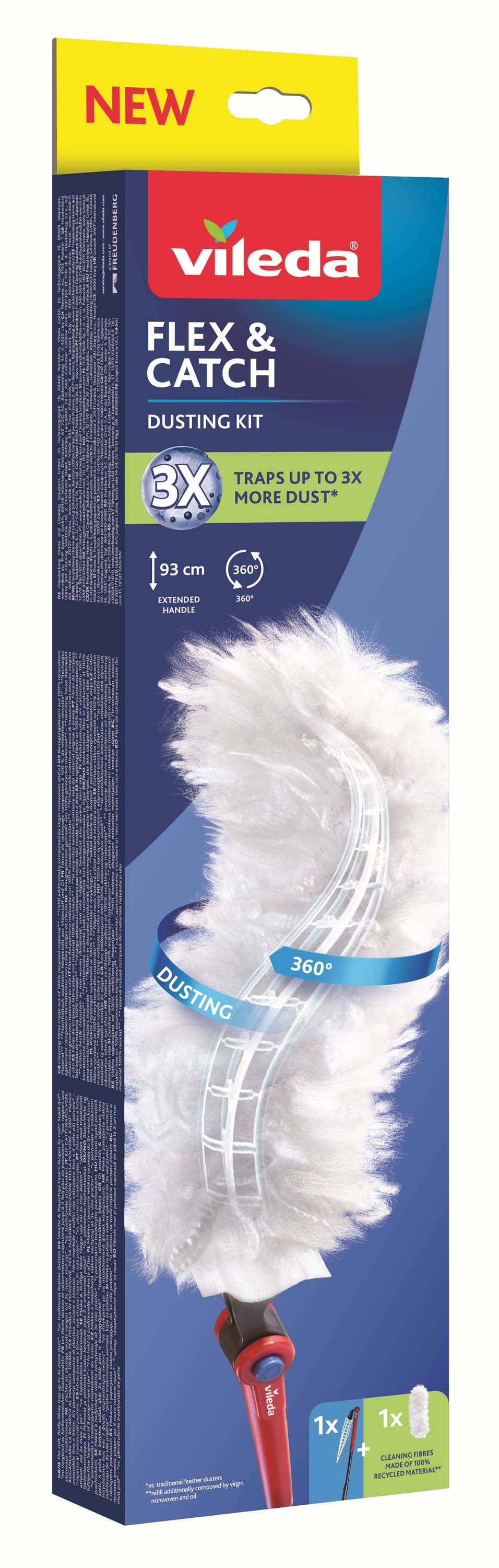 Velkou výhodou je ohebná hlavice, která se přizpůsobí tvaru čištěného povrchu a umožní snadno uklidit i těžko dostupná místa, například horní police, žaluzie, radiátory nebo prostor za nábytkem. Teleskopická rukojeť se prodlužuje až na 93 cm, takže bez problémů dosáhnete i na vyšší skříně nebo stropní části nábytku. Mikrovláknová nadýchaná vlákna po celé 360° ploše účinně zachytávají prach, vlasy i drobné nečistoty a zároveň brání jejich víření zpět do vzduchu. Čisticí vlákna jsou vyrobena ze 100% recyklovaného materiálu.