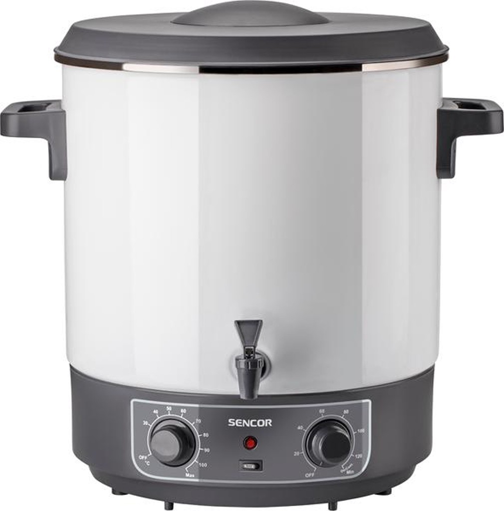 Zavařovací hrnec s objemem 27 l a plynule nastavitelným termostatem, vejde se do něj až 14 zavařovacích sklenic o objemu 1 litr, dvojnásobným bezpečnostním jištěním a smaltovaným povrchem, který nemá vliv na chuť připravovaného jídla. Díky skrytému topnému tělesu, můžete v hrnci připravovat i omáčky, polévky nebo horké nápoje, ty si můžete rovnou stočit do hrníčku pomocí integrovaného výtokového kohoutu.
